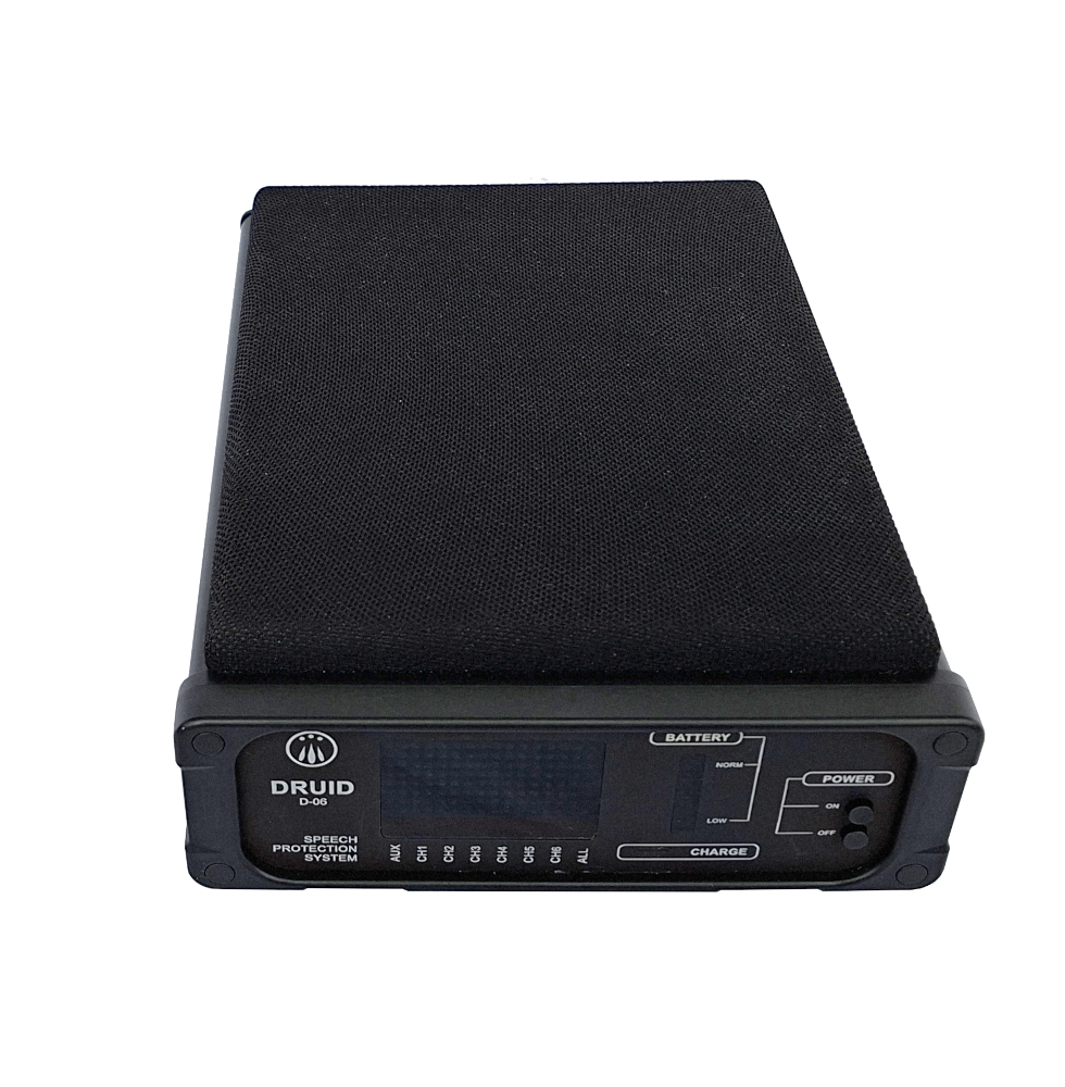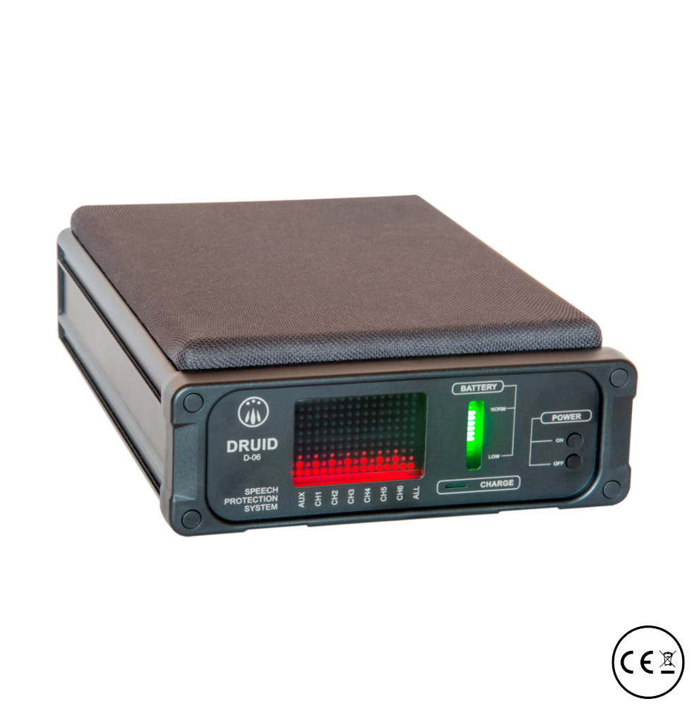 Druid D-06 è un sistema professionale per la protezione delle conversazioni, progettato per rendere inefficace qualunque tentativo di intercettazione ambientale, sia esso condotto tramite qualsiasi tipologie di microspie (captatori ambientali), cellulari in registrazione, registratori digitali, sistemi laser o sensori a muro.