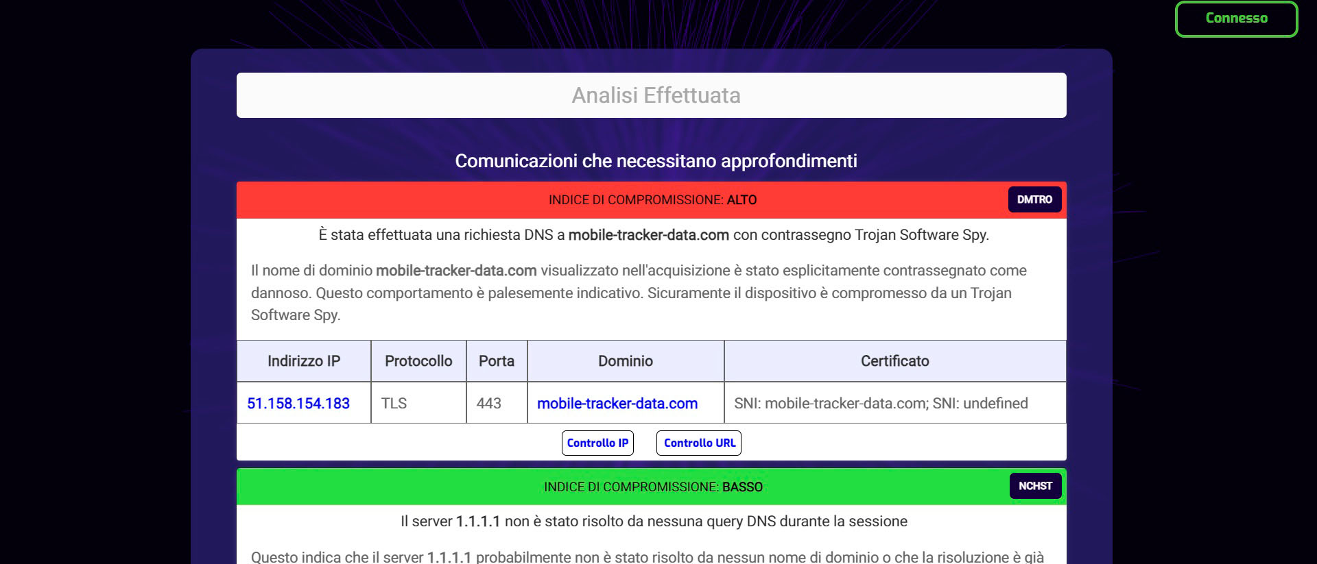 - Connessioni verso domini e/o IP potenzialmente malevoli.